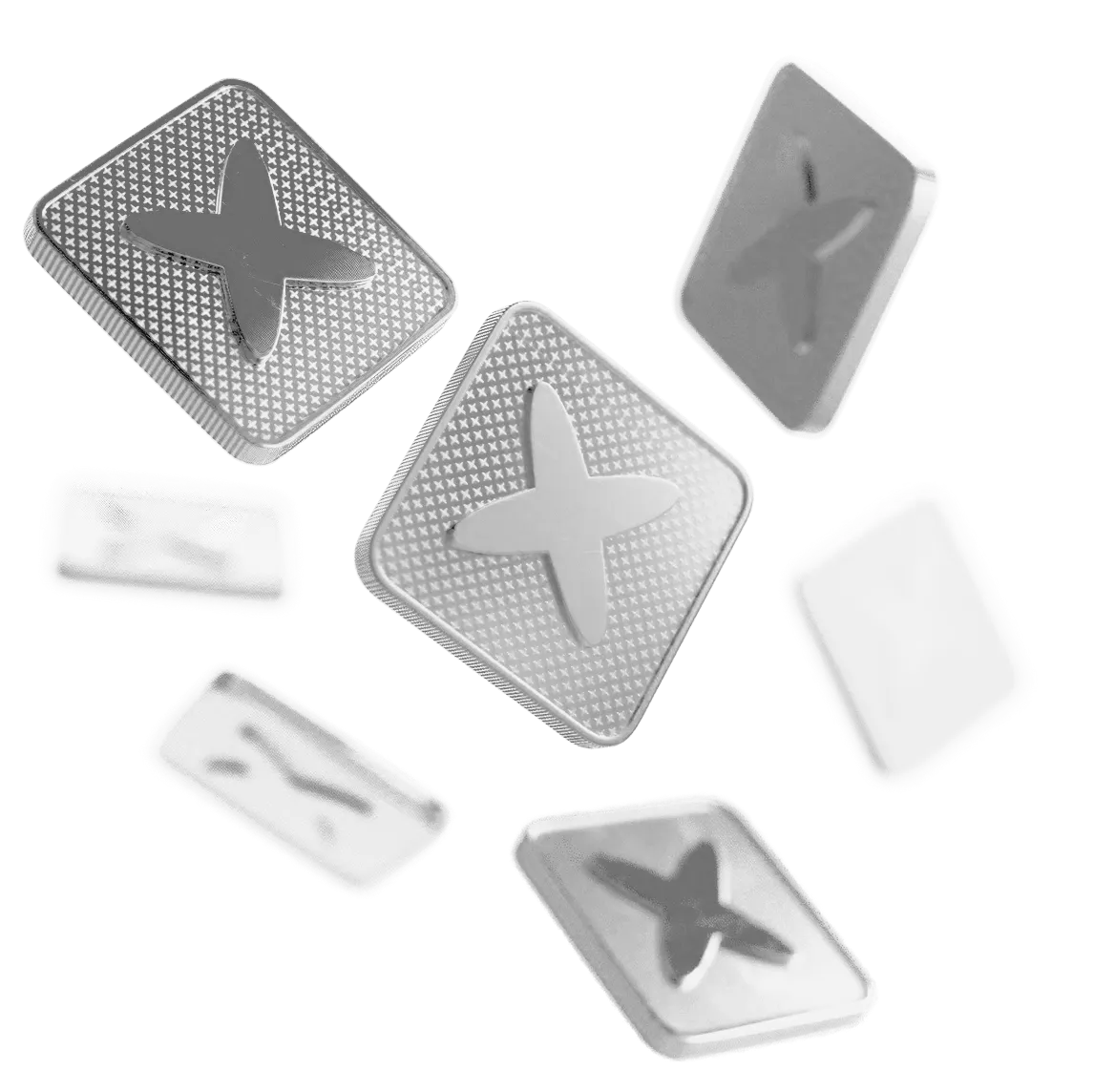 LivLive reward tokens - two stacked square silver cryptocurrency tokens with embossed X design for AR gaming